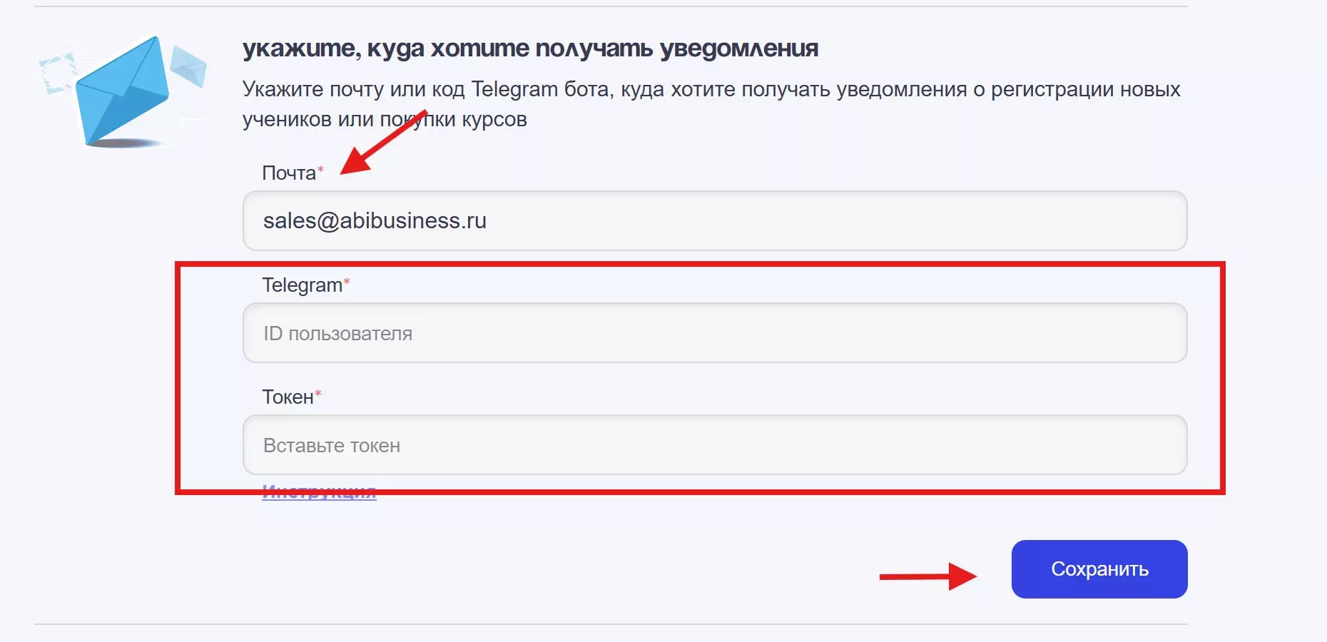 Сервис создания платформ для онлайн обучения присылает уведомления на почту о событиях на самой платформе и событиях, которые происходят в созданной онлайн-школе. По умолчанию все уведомления будут приходить на почту, указанную при регистрации. Данную почту можно поменять в настройках профиля в соответствующей форме.