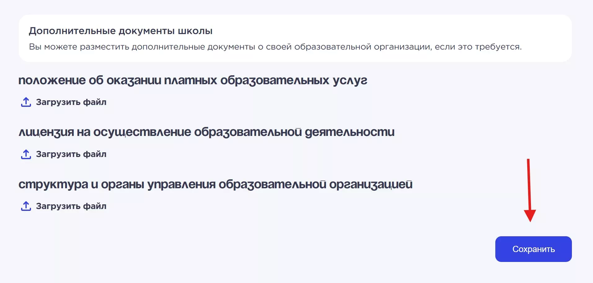 Также на платформе обучения можно размещать минимальный пакет дополнительных документов, загрузите документы и нажмите кнопку «Сохранить».