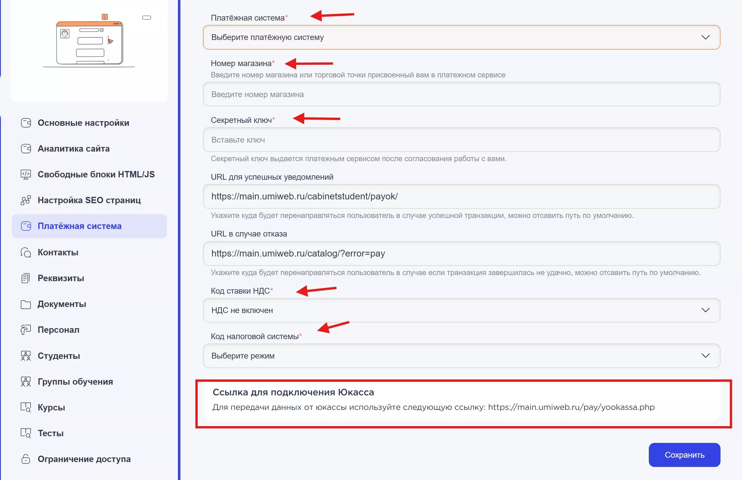 Если вы используете платежную систему, которой нет в списке и хотите ее подключить, напишите нам в службу поддержки, мы настроим и подключим ее бесплатно для вас в течении 1 дня, пока вы заполняете каталог курсов.