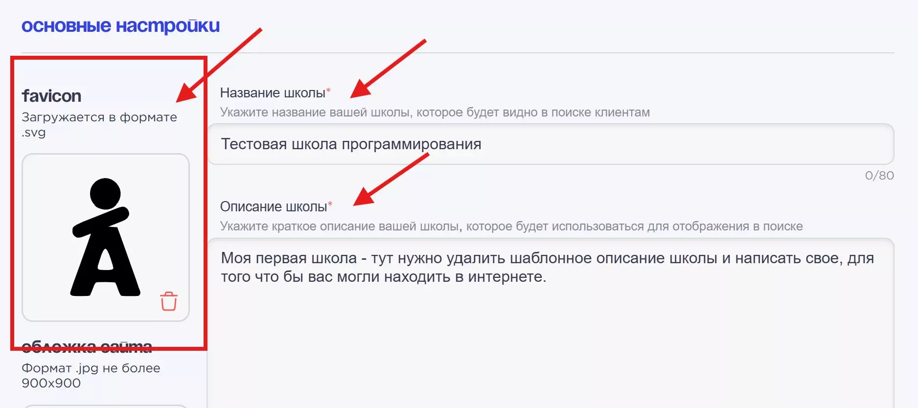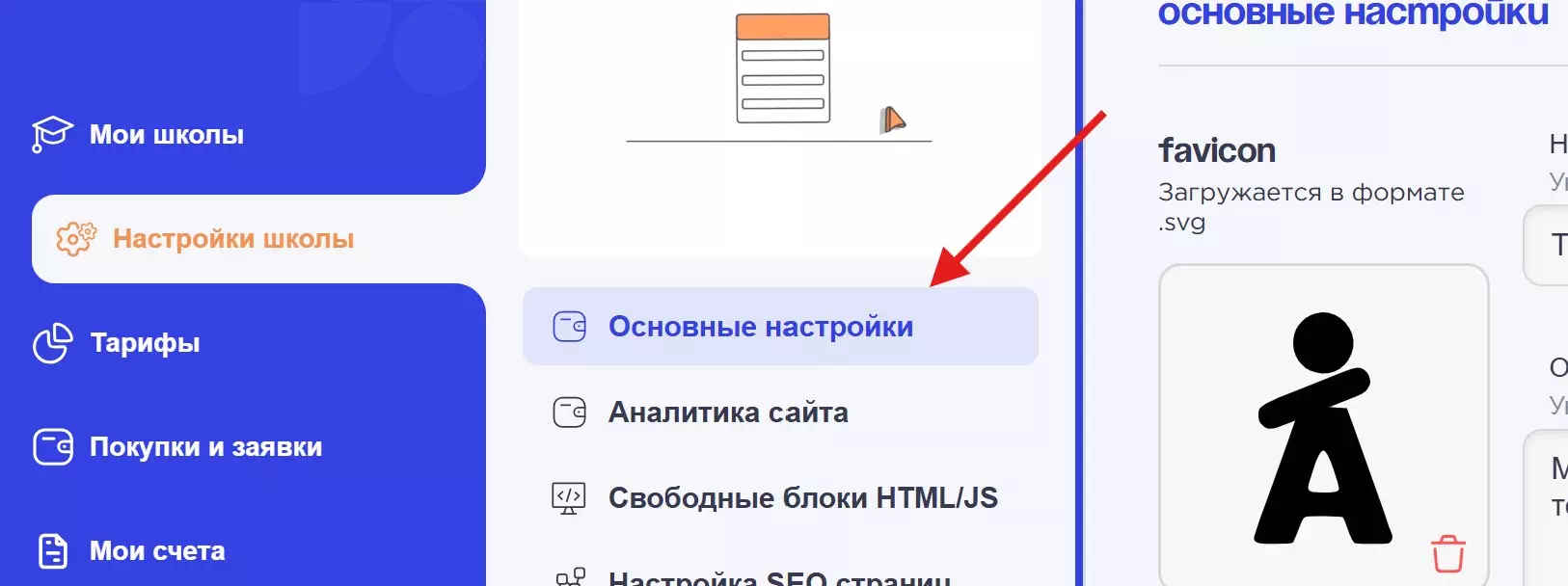 Для того что бы перейти к основным настройкам созданной школы, нажмите соответствующий пункт меню «Основные настройки»