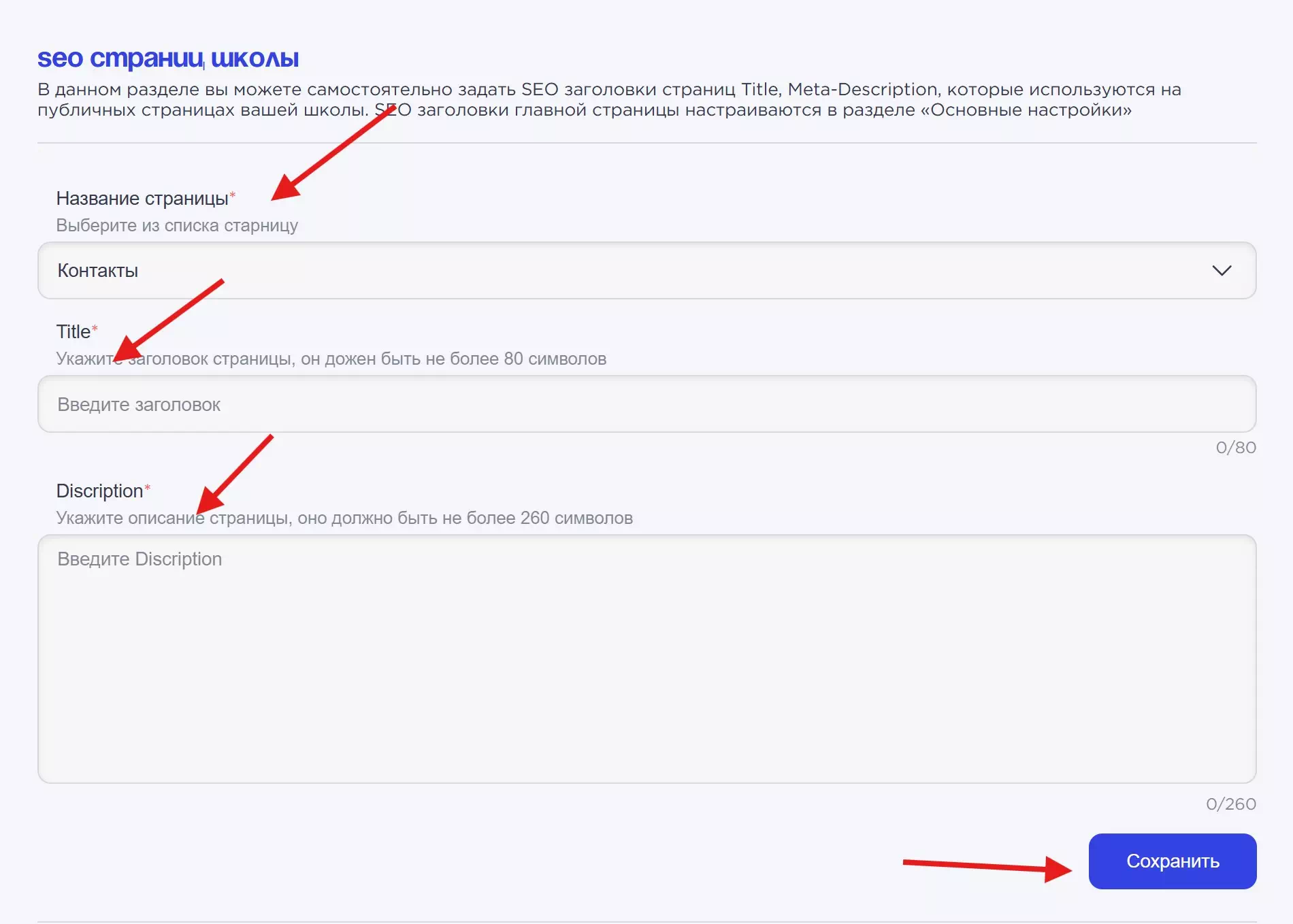 Сервис создания платформ для онлайн обучения «UMIWEB» позволяет настраивать SEO для заголовков страниц, которые используются в многостраничном сайте школы. Для внесения своего заголовка, выберите название страницы, затем введите Title заголовок и meta-description, после нажмите кнопку «Сохранить»