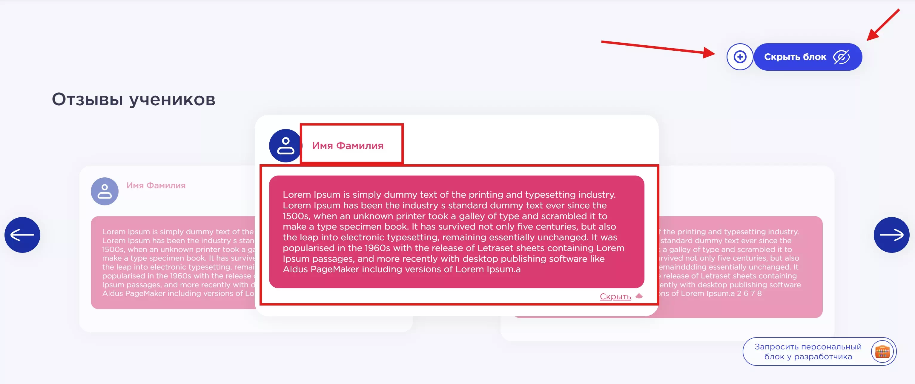 В данном блоке вы можете публиковать текстовые отзывы о своей онлайн-школе путем добавления новых, если вы не хотите что бы данный блок отображался на странице, вы его можете скрыть.