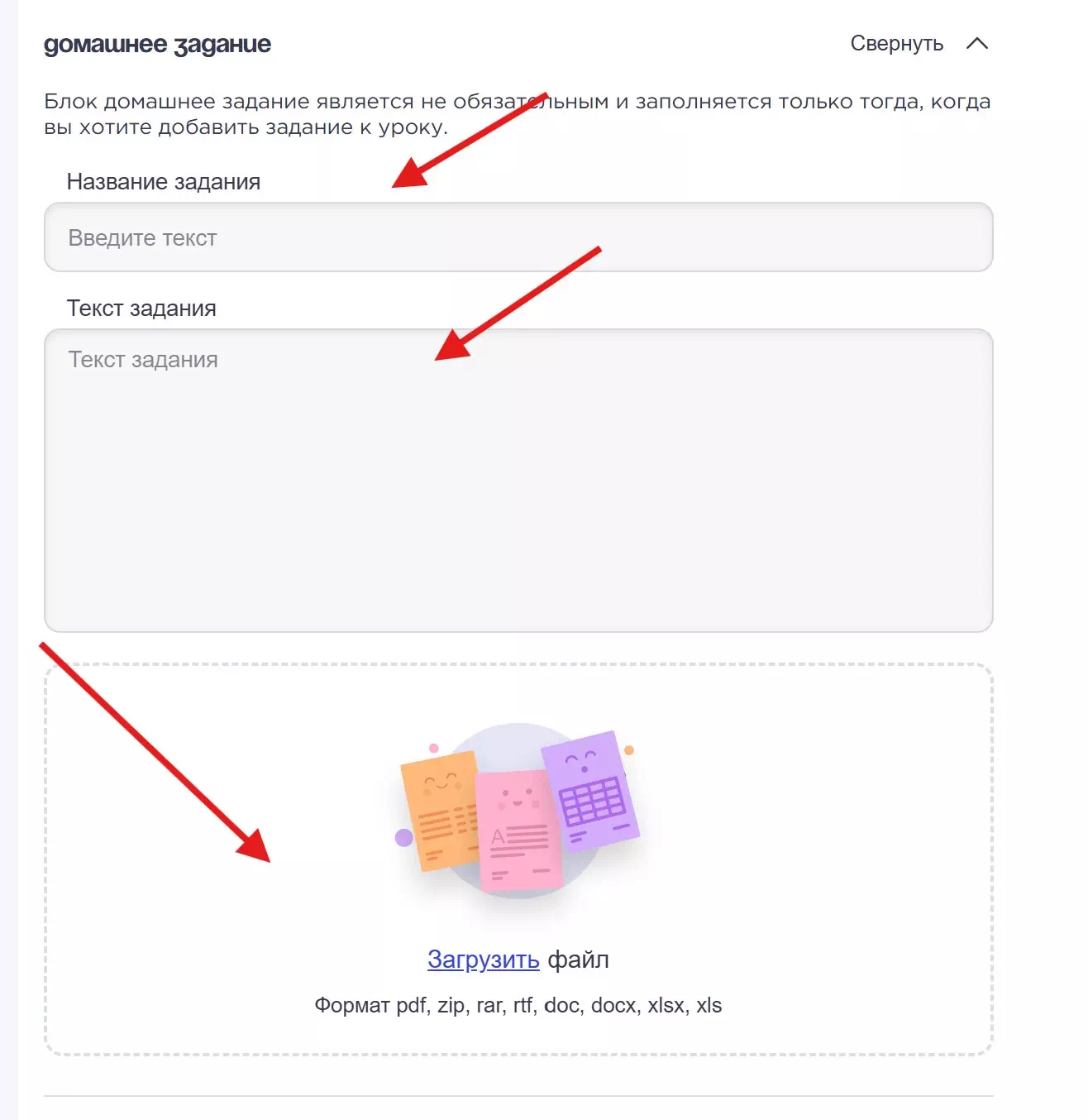 Для добавления домашнего задания нужно заполнить следующие поля:
