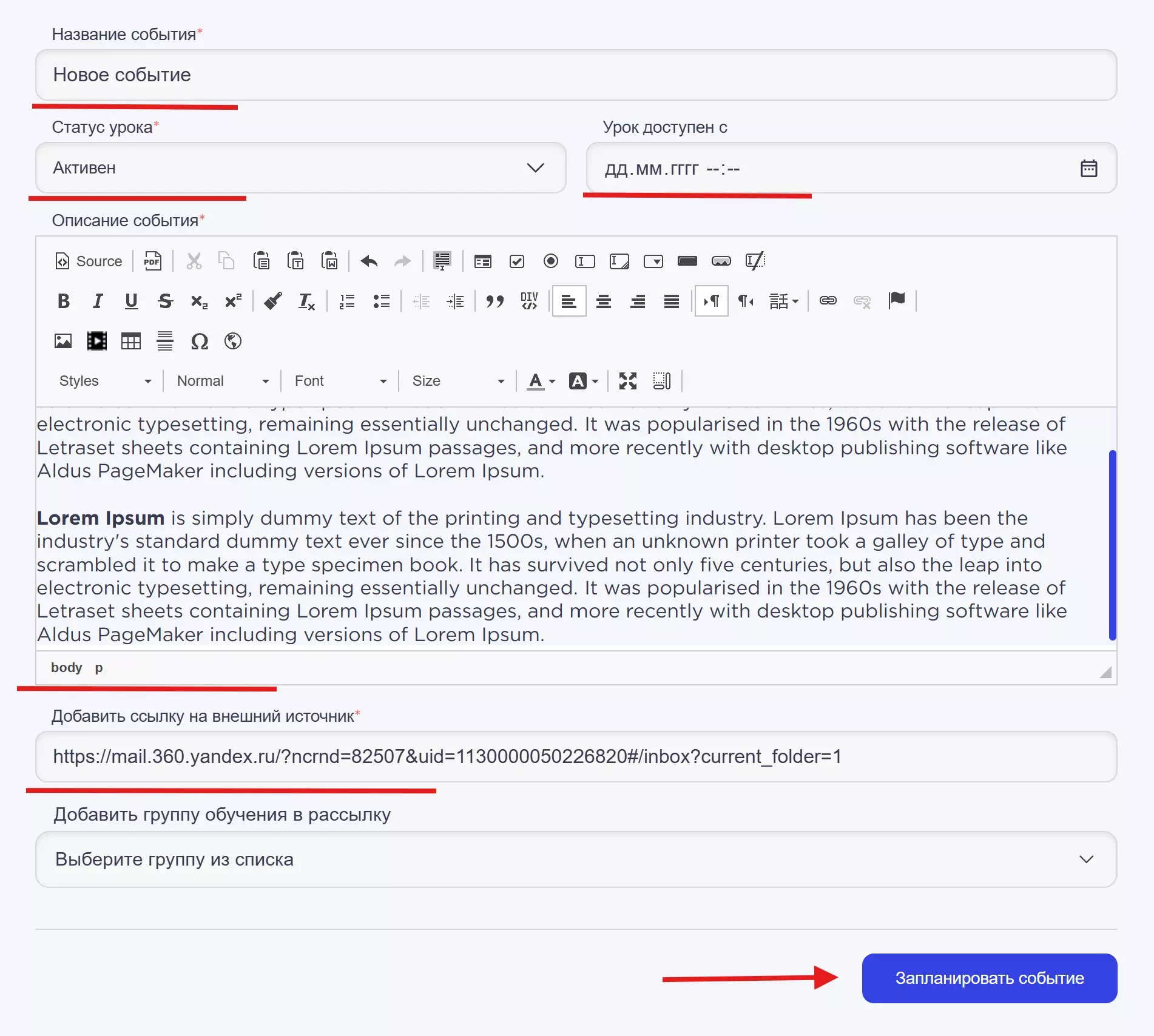 Для того чтобы добавить новое событие вам необходимо заполнить следующие поля: