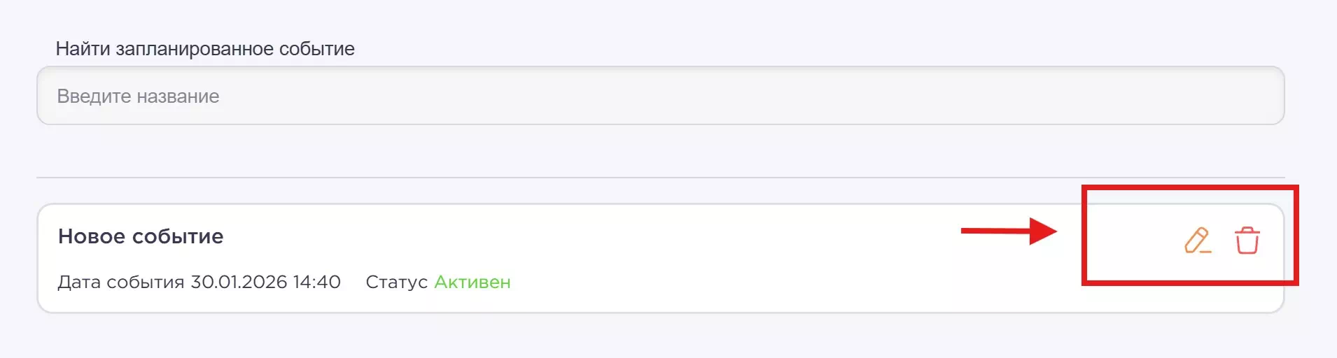 После того как событие создано, его можно найти ниже в списке событий.