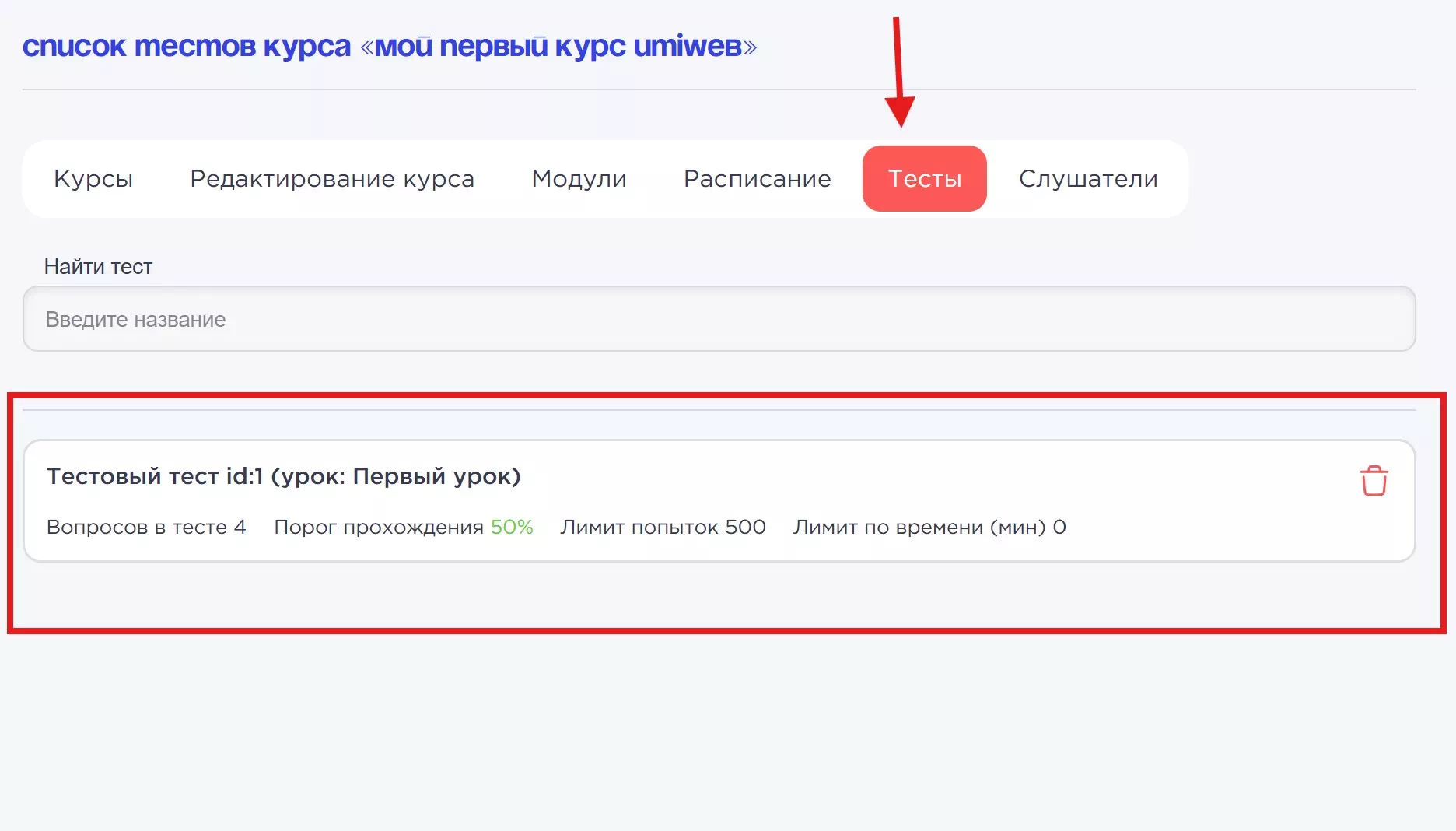 В данном разделе можно удалять добавленные тесты из курса.