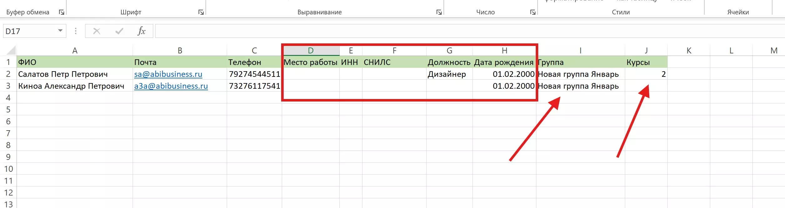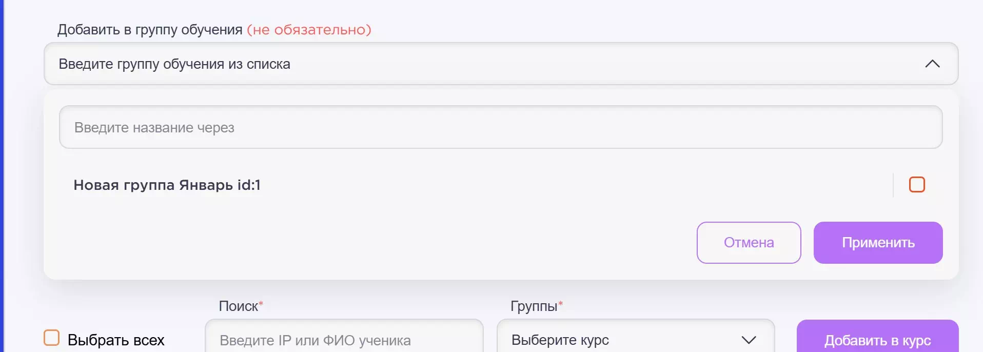 Студенты можно сразу добавить в онлайн-курс обучения или группу обучения, для этого вам необходимо выбрать следующие поля: