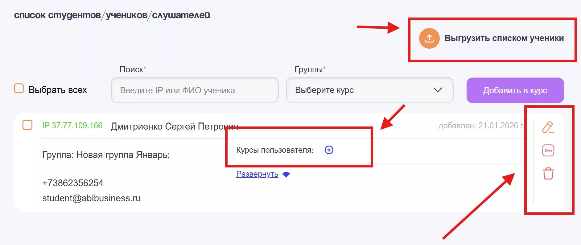 После добавления пользователей в систему, вы можете найти нужно пользователя в списке студентов, который отображен ниже.