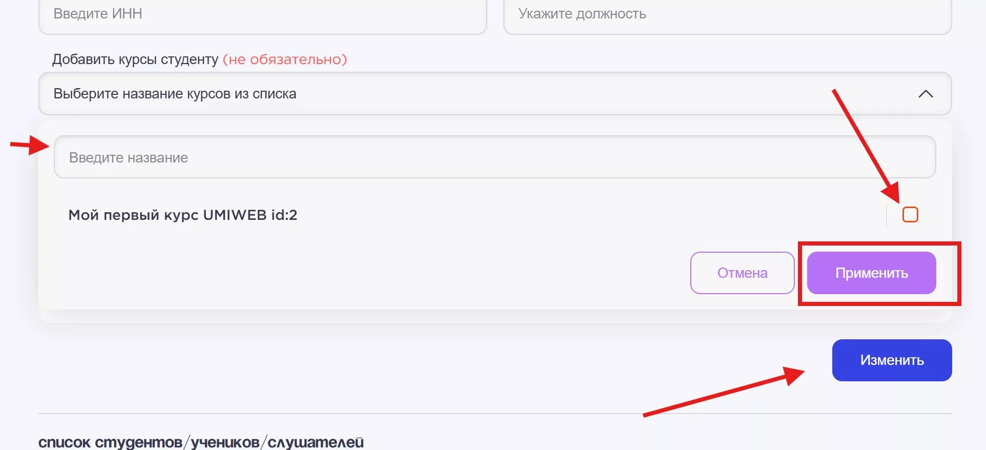 Также добавить курсы можно через карточку студента в списке пользователей, в таком случае появится всплывающие окно со списком курсов, вы можете найти нужные курсы через поиск и добавить их студенту в профиль, тем самым открыть доступ к обучению.