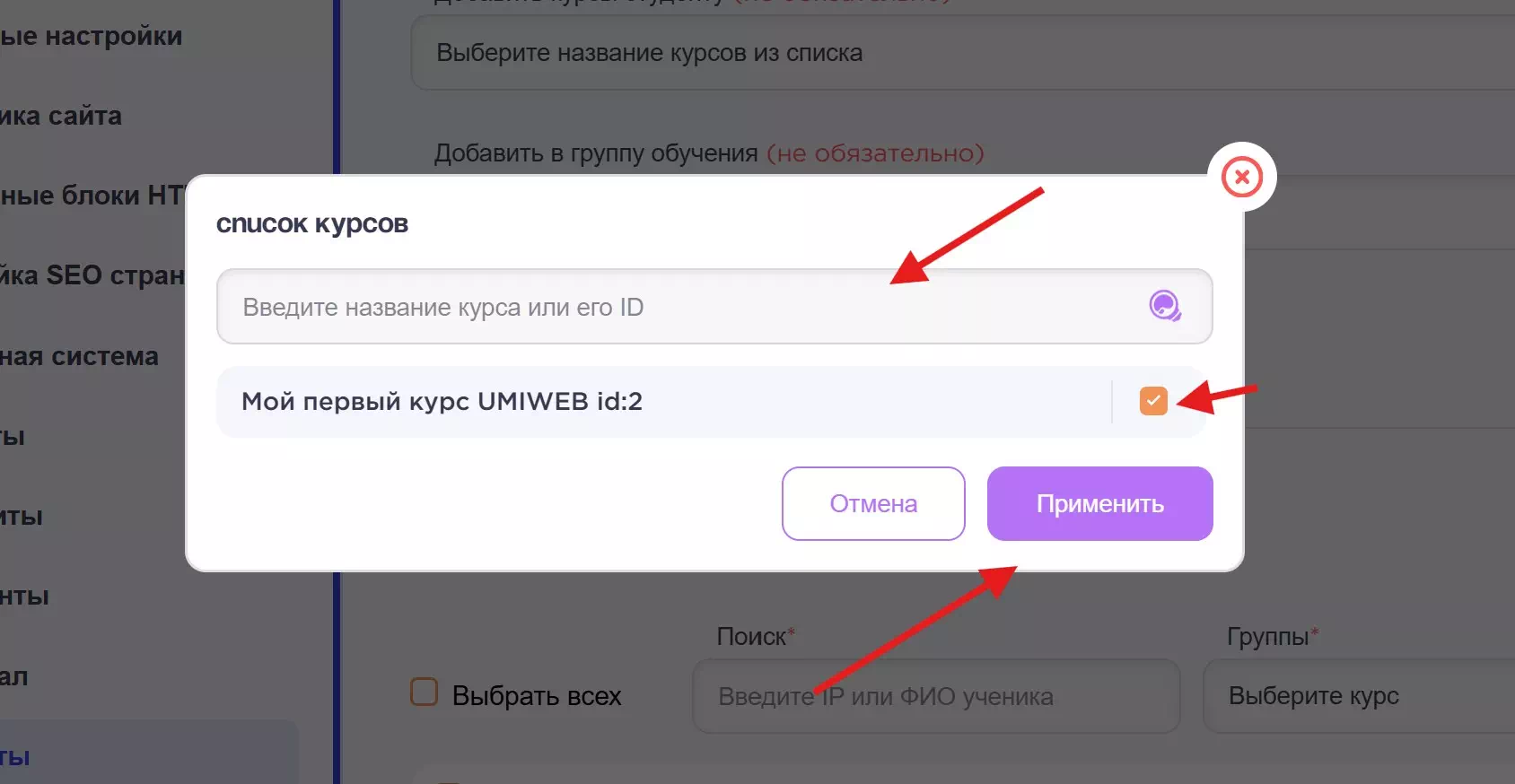 Выберите нужные курсы из списка и нажмите кнопку «применить»