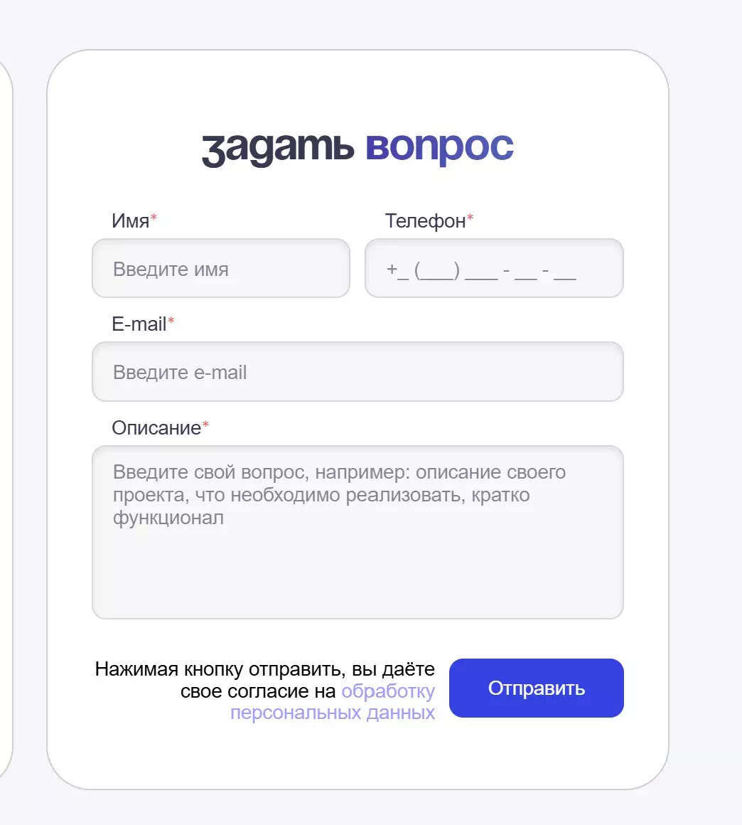 Вы всегда можете задать нам любой интересующий вас вопрос, для этого на лавной странице сайта есть специальная форма, заполните ее обязательные поля и нажмите кнопку «Отправить». Мы получим ваш вопрос и свяжемся с детальным ответом.