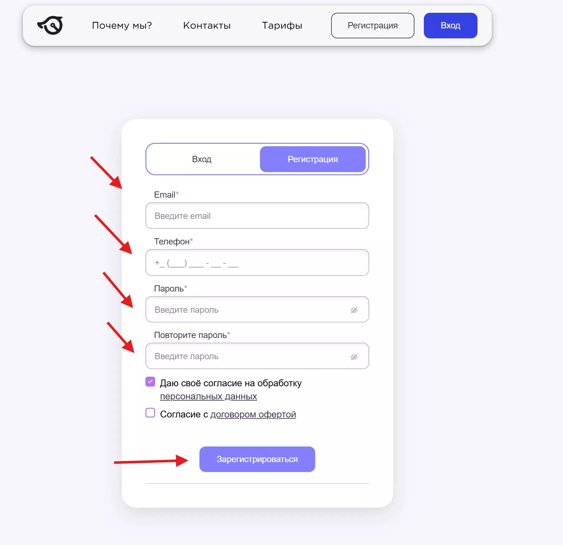 Для того чтобы воспользоваться всеми возможностями платформы, необходимо пройти регистрацию, для это перейдите на страницу «Регистрация» и в специальной форме введите свои данные: электронная почта, телефон и придумайте пароль. Вам так же необходимо дать согласие с политикой платформы.